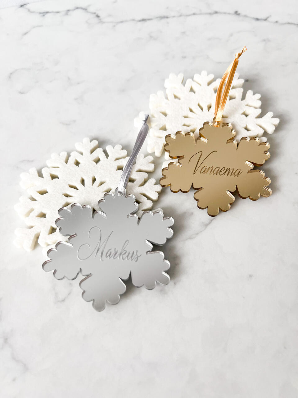 Peegelakrüülist kuldsed ja hõbedased ehted, millele saate lisada nime. Paela värv on vastavalt