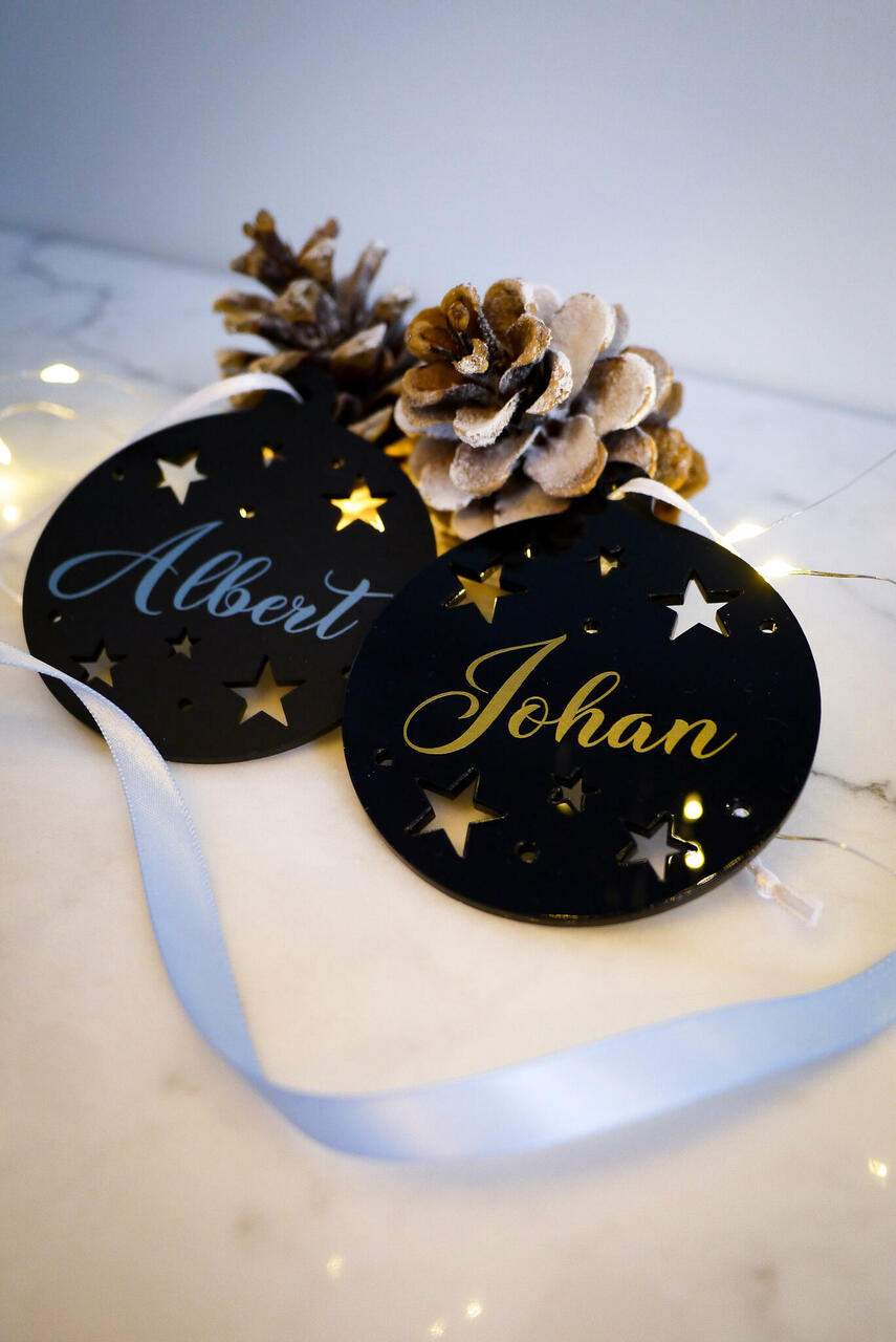 Matist või läikivast mustast akrüülist ehted, millel toredad väljalõiked. Saate ehtele lisada endale meelepärases värvis kleebisega nime. Valikus on must ja valge pael ning kaks erinevat kirjastiili.