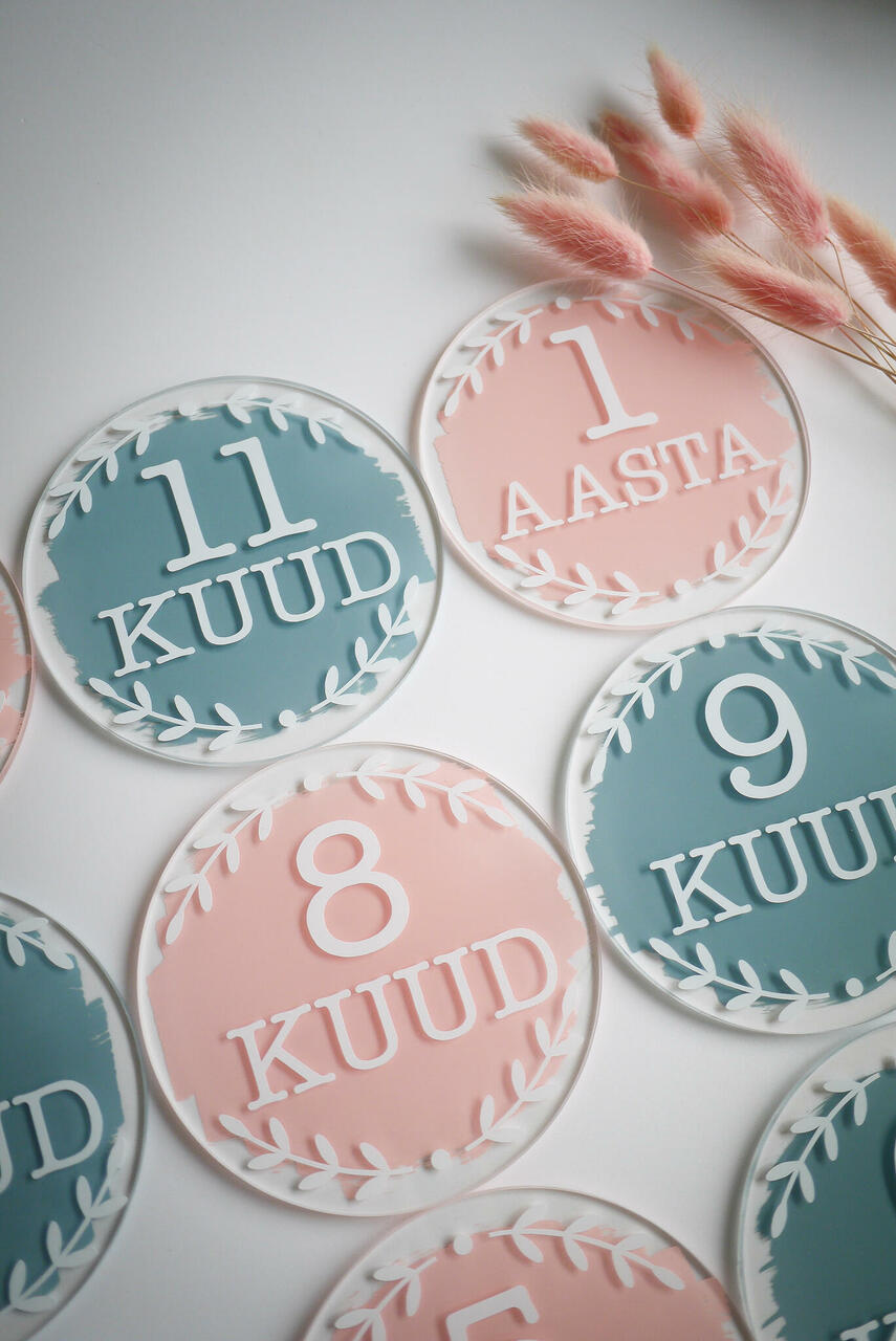 Toredad akrüülist kaardid, et tähistada beebi igakuiseid minisünnipäevasid. Tausta värviks saab valida roosa või sinise.