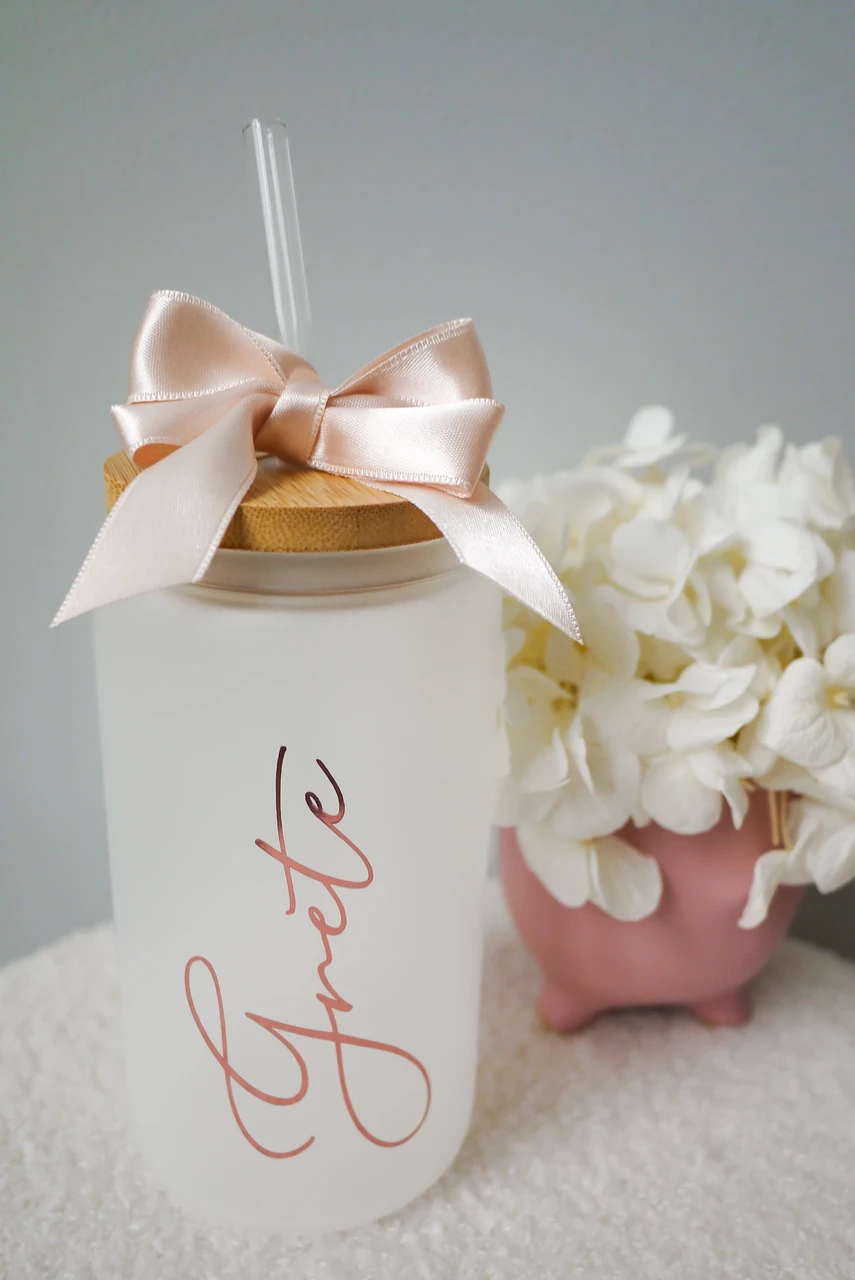 Klaasist joodupudel, millele saate lisada ka enda nime. Joogipudelil on ka klaasist kõrs, millele tuleb kaasa ka puhastamiseks harjake.