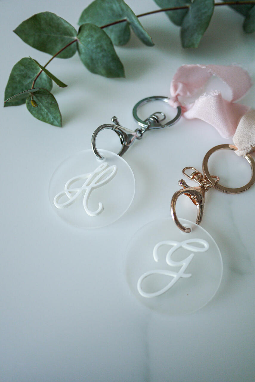Matist läbipaistvast akrüülist võtmehoidja, millel valge matt initsiaal. Võtmehoidjale saate valida meelepärast värvi võtmerõnga ja paela.
