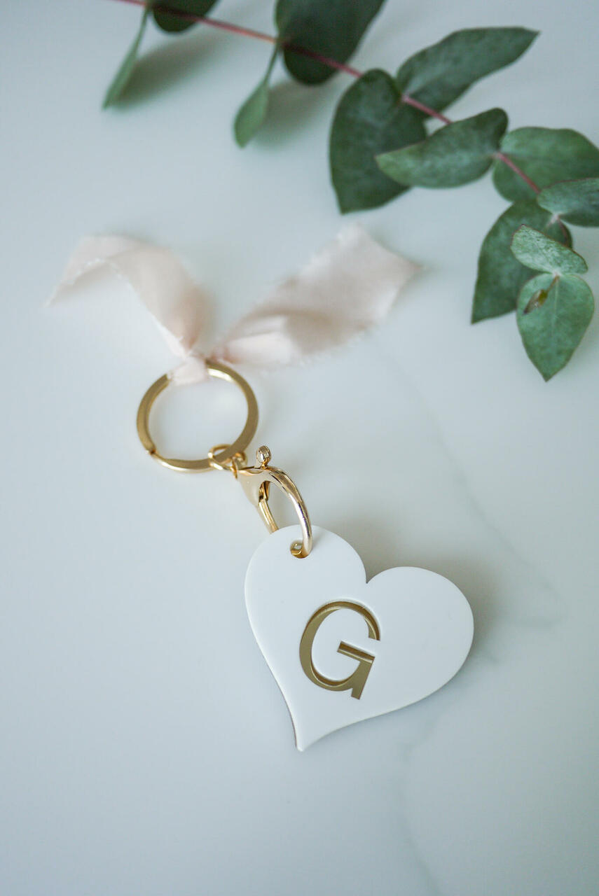 Valgest akrüülist võtmehoidja, mille sees kuldne või hõbedane initsiaal. Juurde saate lisada endale meelepärase võtmerõnga ja paela.